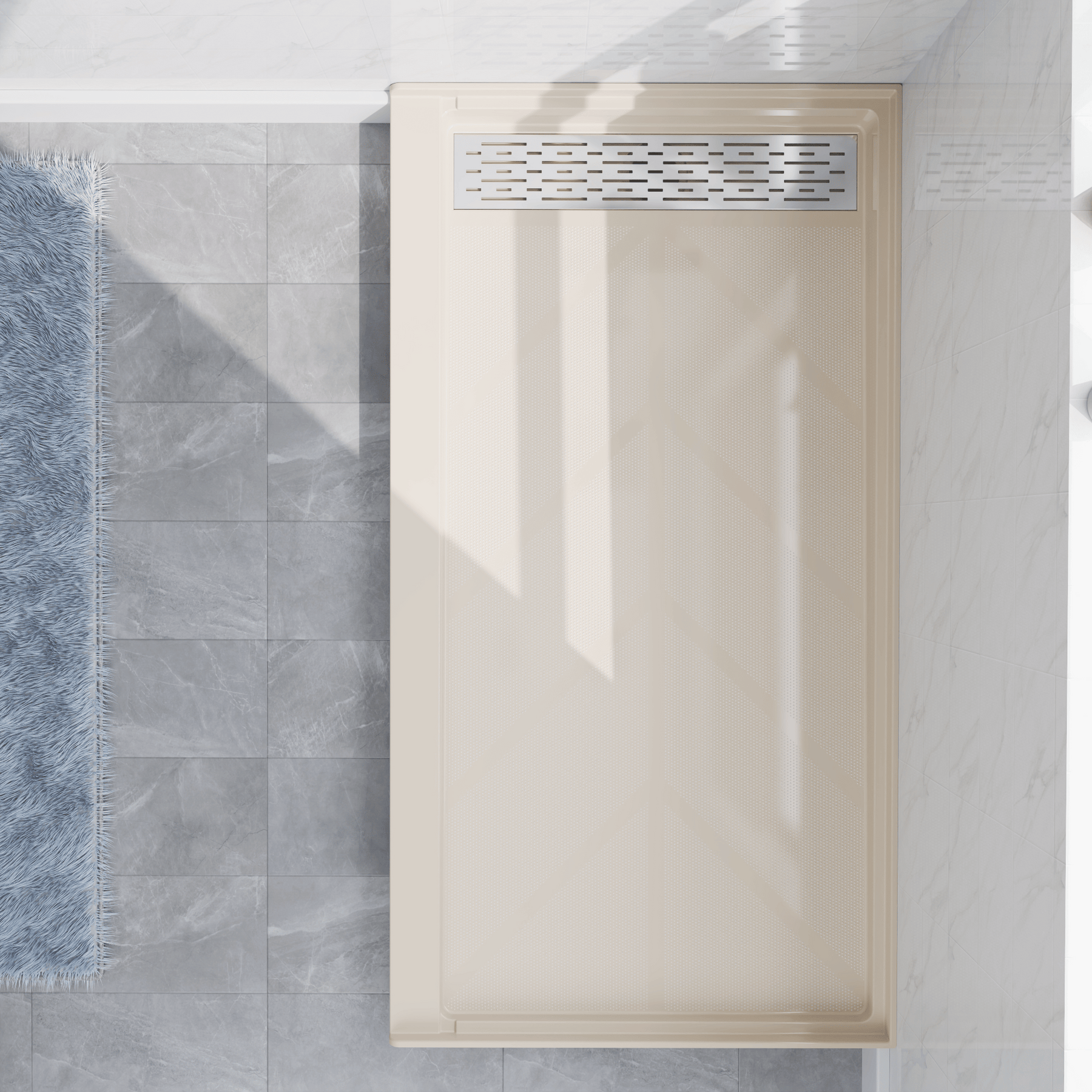 Top view of 60" x 32" SMC Shower Base with right Stainless Steel Linear Drain Cover, Beige Shower Pan Base in modern bathroom