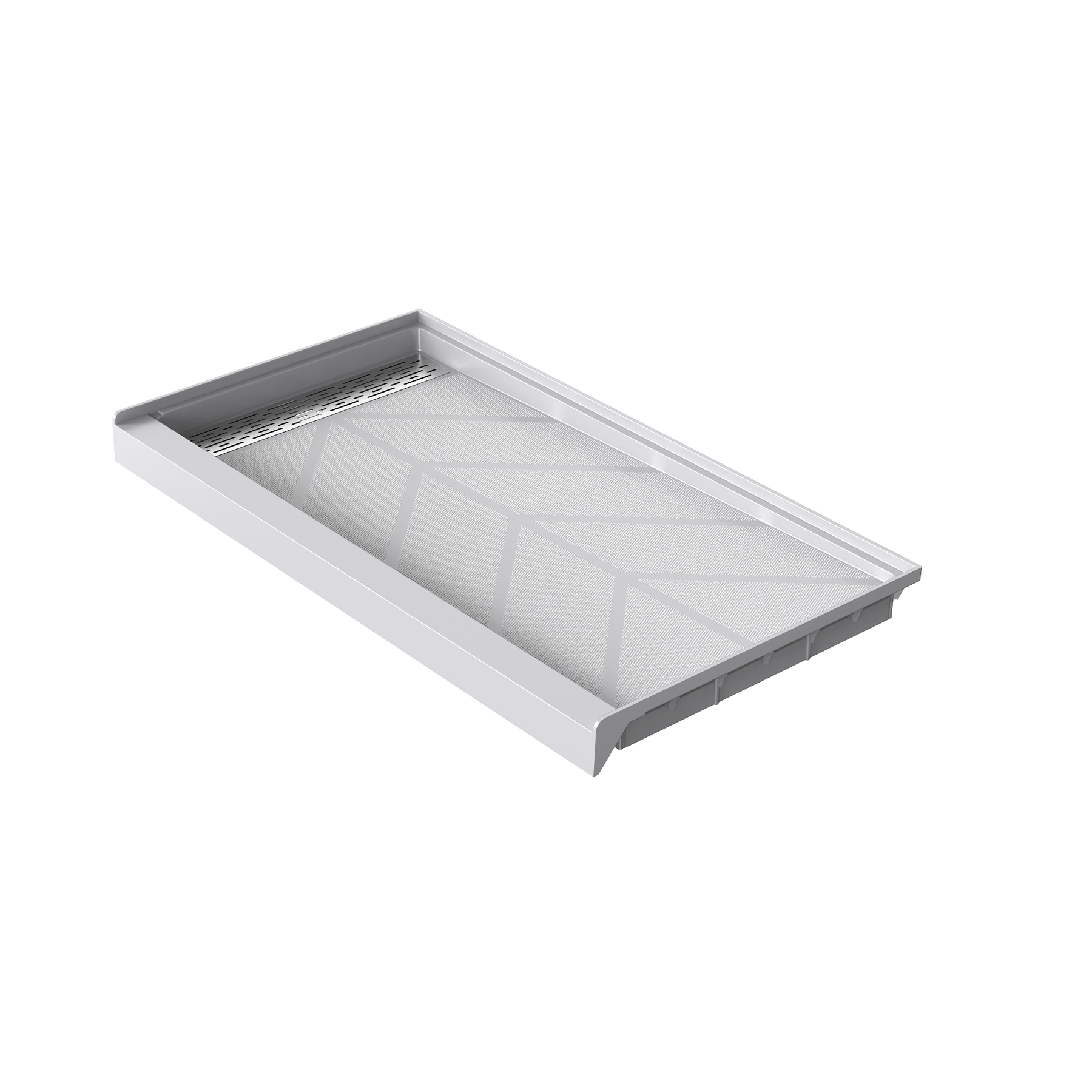 Side view of 60" x 32" SMC Shower Base with right Stainless Steel Linear Drain Cover, Gray Shower Pan Base in modern bathroom