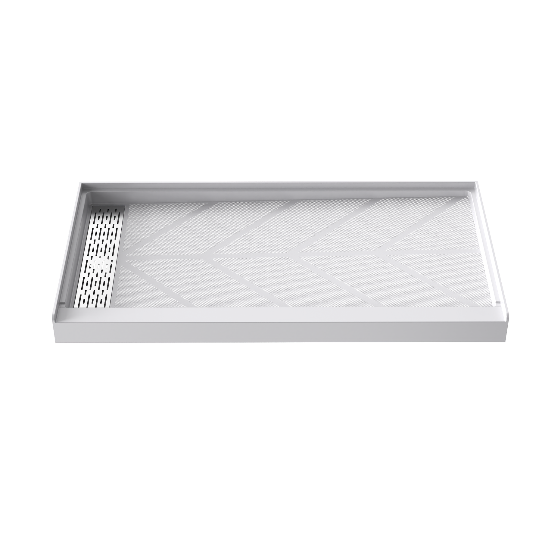 Side view of 60" x 32" SMC Shower Base with left Stainless Steel Linear Drain Cover, Glossy White Shower Pan Base in white background