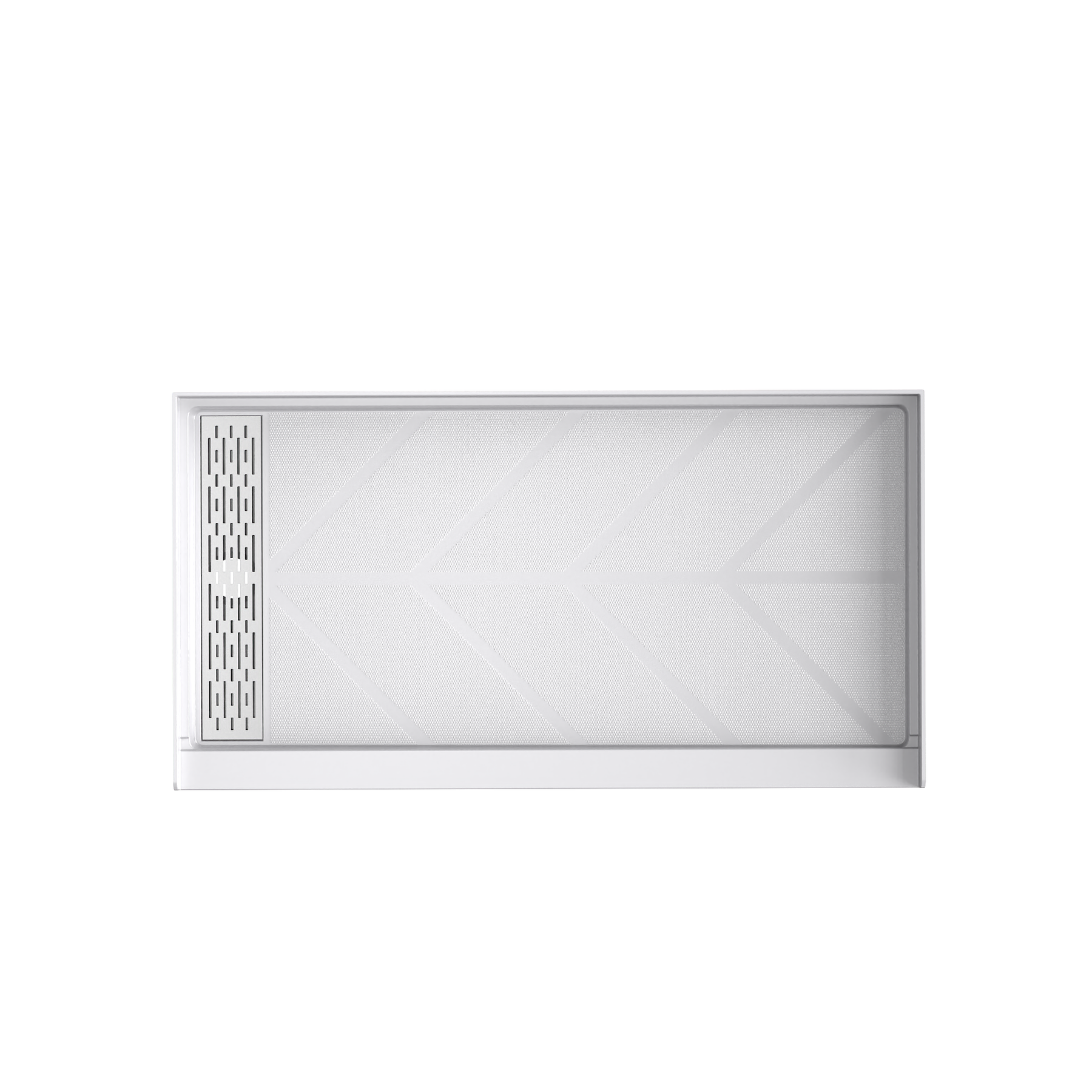 Top view of 60" x 32" SMC Shower Base with left Stainless Steel Linear Drain Cover, Glossy White Shower Pan Base in white background