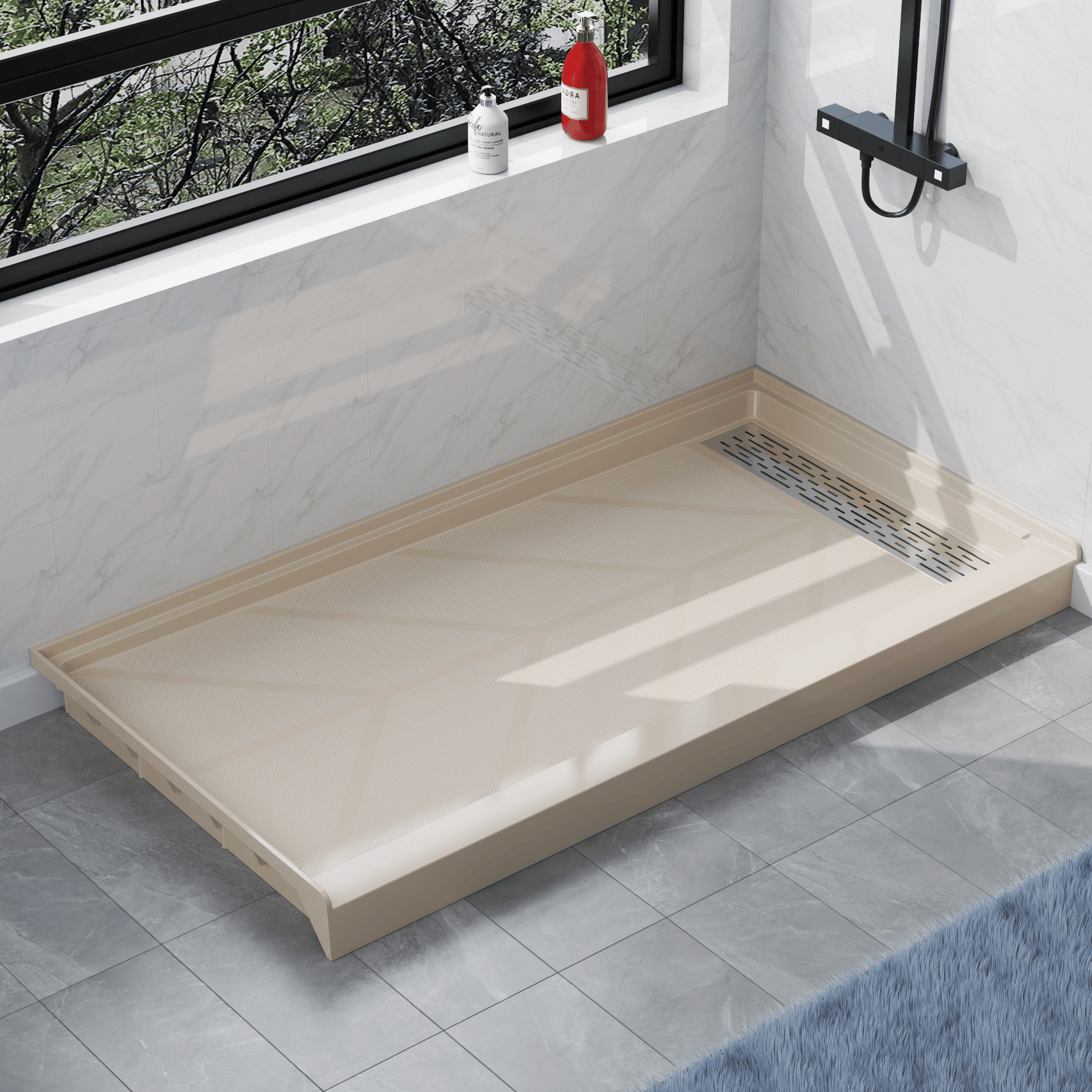 Side view of 60" x 32" SMC Shower Base with right Stainless Steel Linear Drain Cover, Beige Shower Pan Base in modern bathroom