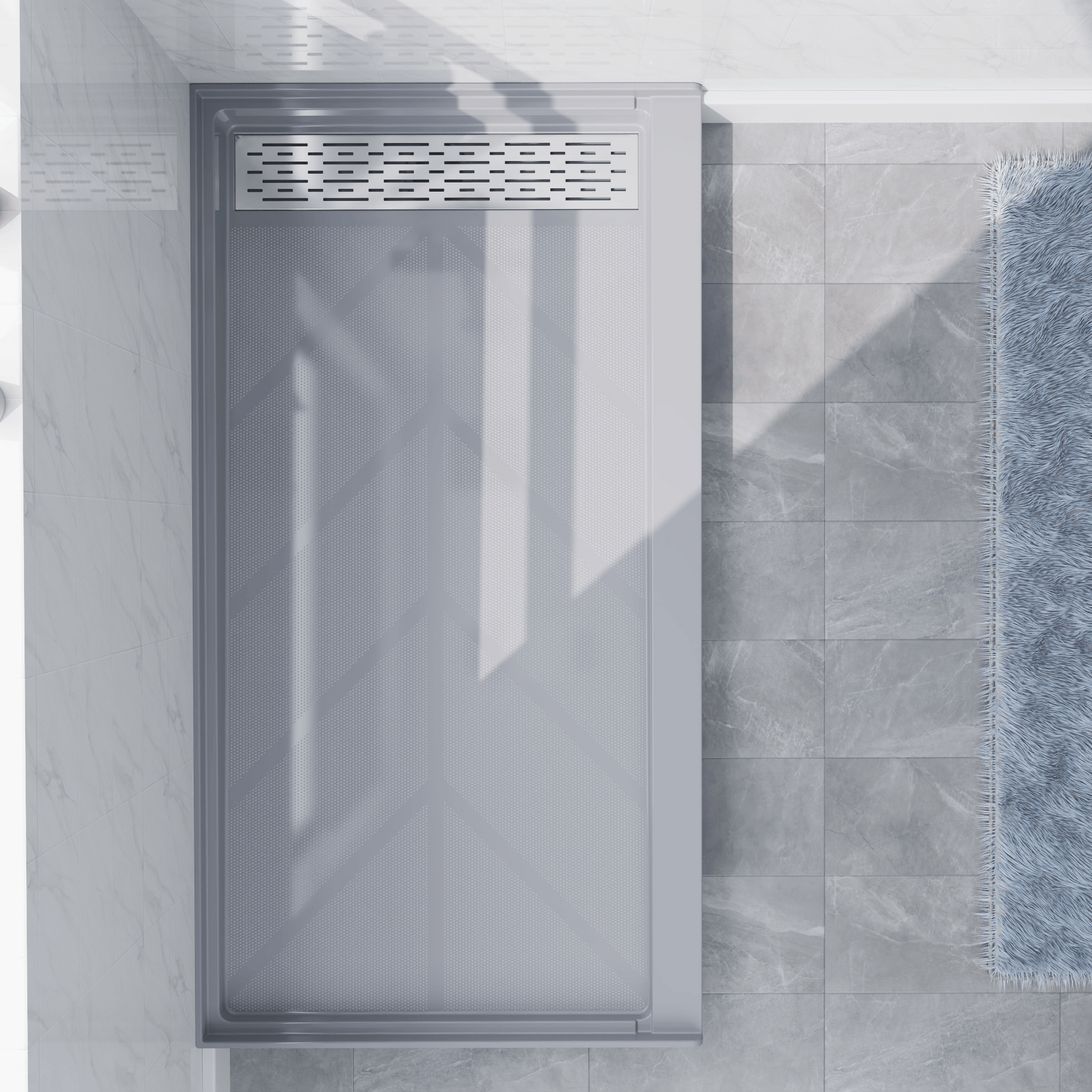 Top view of 60" x 32" SMC Shower Base with right Stainless Steel Linear Drain Cover, Gray Shower Pan Base in modern bathroom