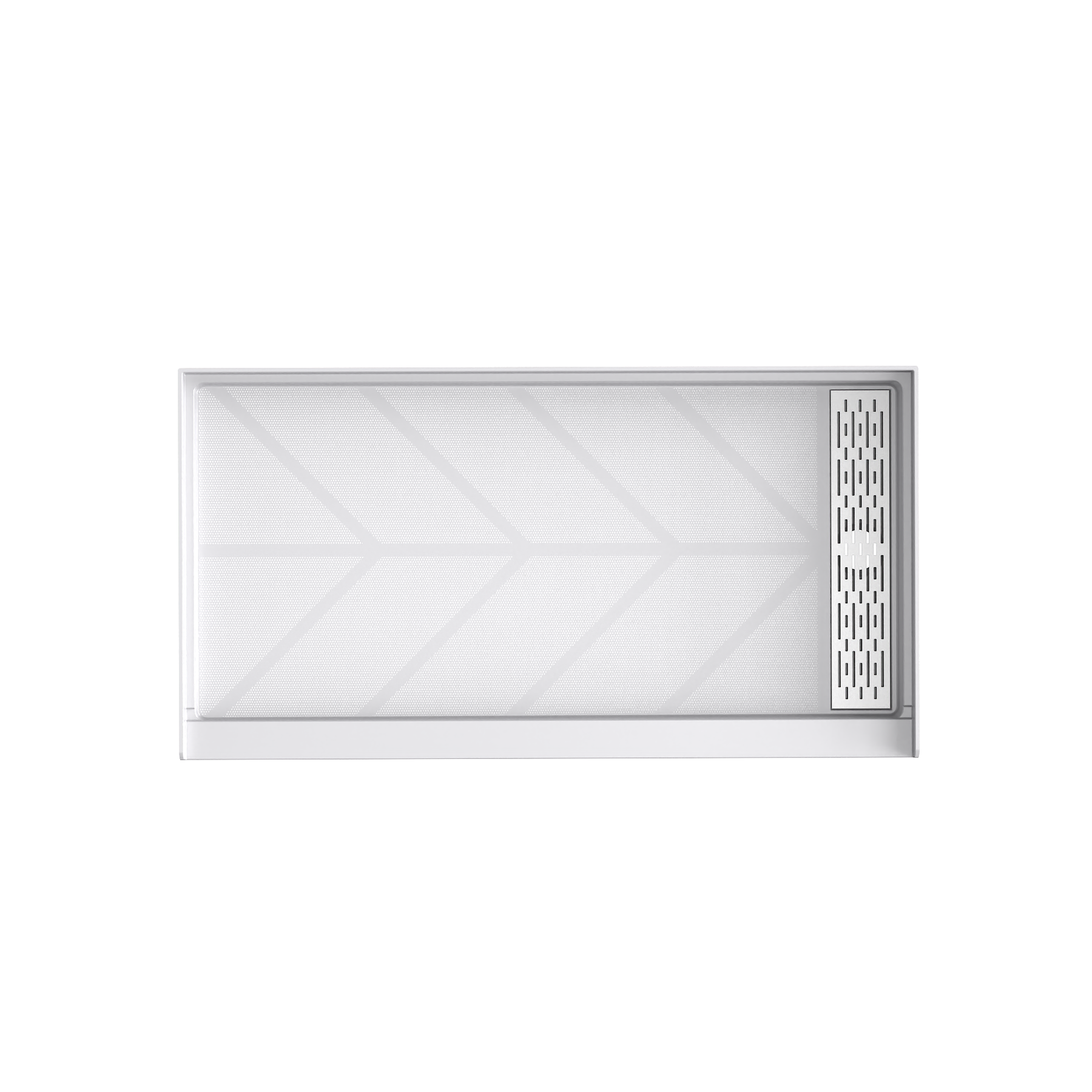 Top view of 60" x 32" SMC Shower Base with right Stainless Steel Linear Drain Cover, Glossy White Shower Pan Base in white background